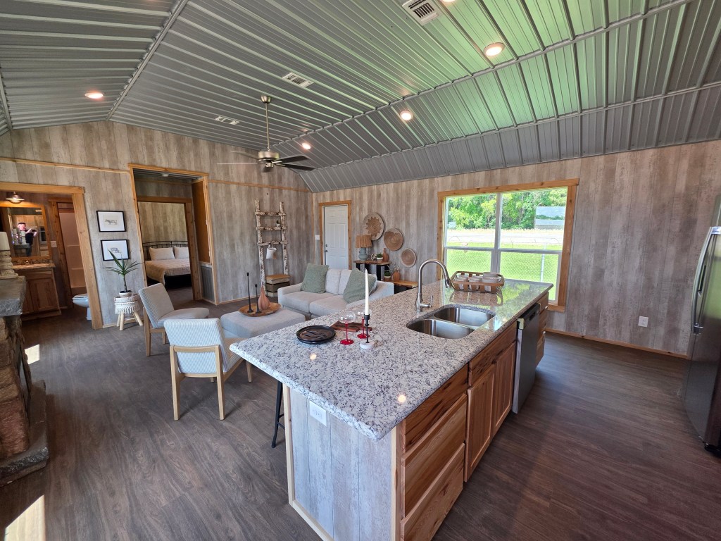 The Farmstead includes a three-ton central HVAC, refrigerator, microwave, stove, oven, dishwasher, the aforementioned stackable washer/dryer, and in-line water heater. It is insulated floor to ceiling.