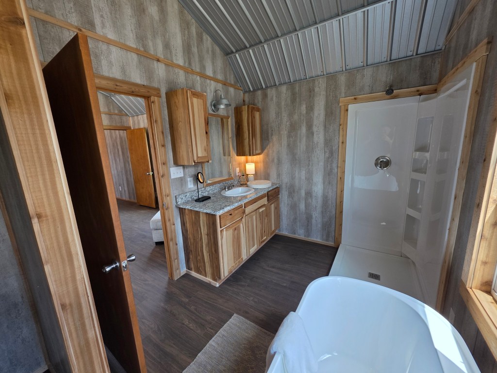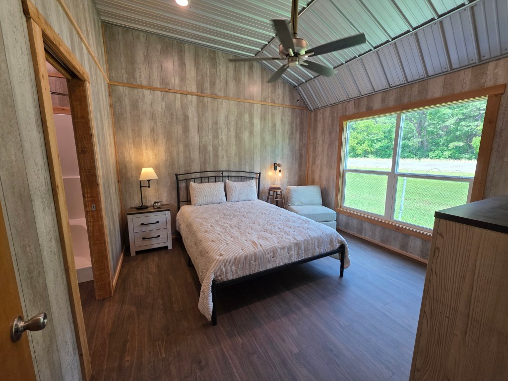 The bedroom looks dark from this angle, but there is an entire wall of windows on the front wall.; you can see them in pic below. Featured in this model are Pallet paneling for an especially rustic look.