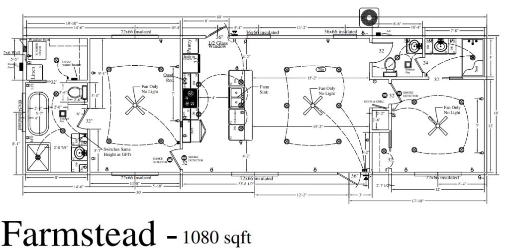 The Farmstead is an 18ft by 60ft (1080sf) two-bed/two-bath cabin with barn-style roofing. Featuring two dormers, the Farmstead is an open, bright model that feels much larger than its square footage. With doors on the front and back, it is ready to add a deck to either side. If you want a country themed cabin, the barn-style is perfect for you!