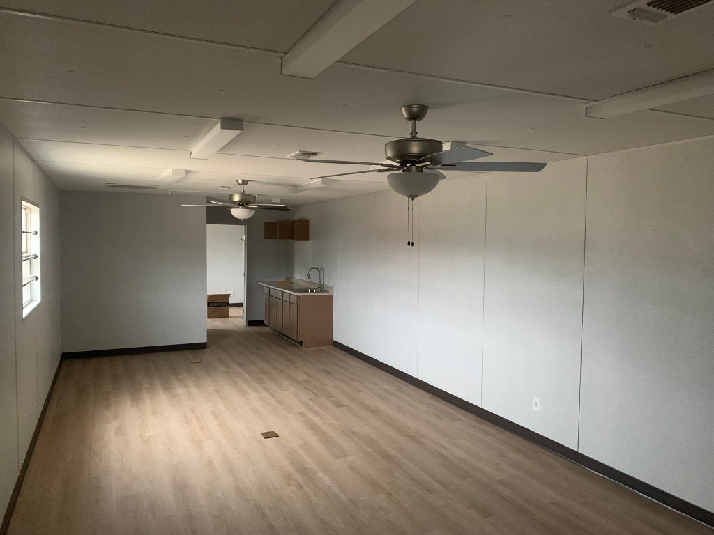 Very straightforward design, with an office on each end and a large room in the middle. It was surprising to see only space for a half fridge: whoever ordered this was all business. Built for functionality, it featured steel doors and window bars, vinyl paneling for walls and flooring, with a gypsum ceiling.